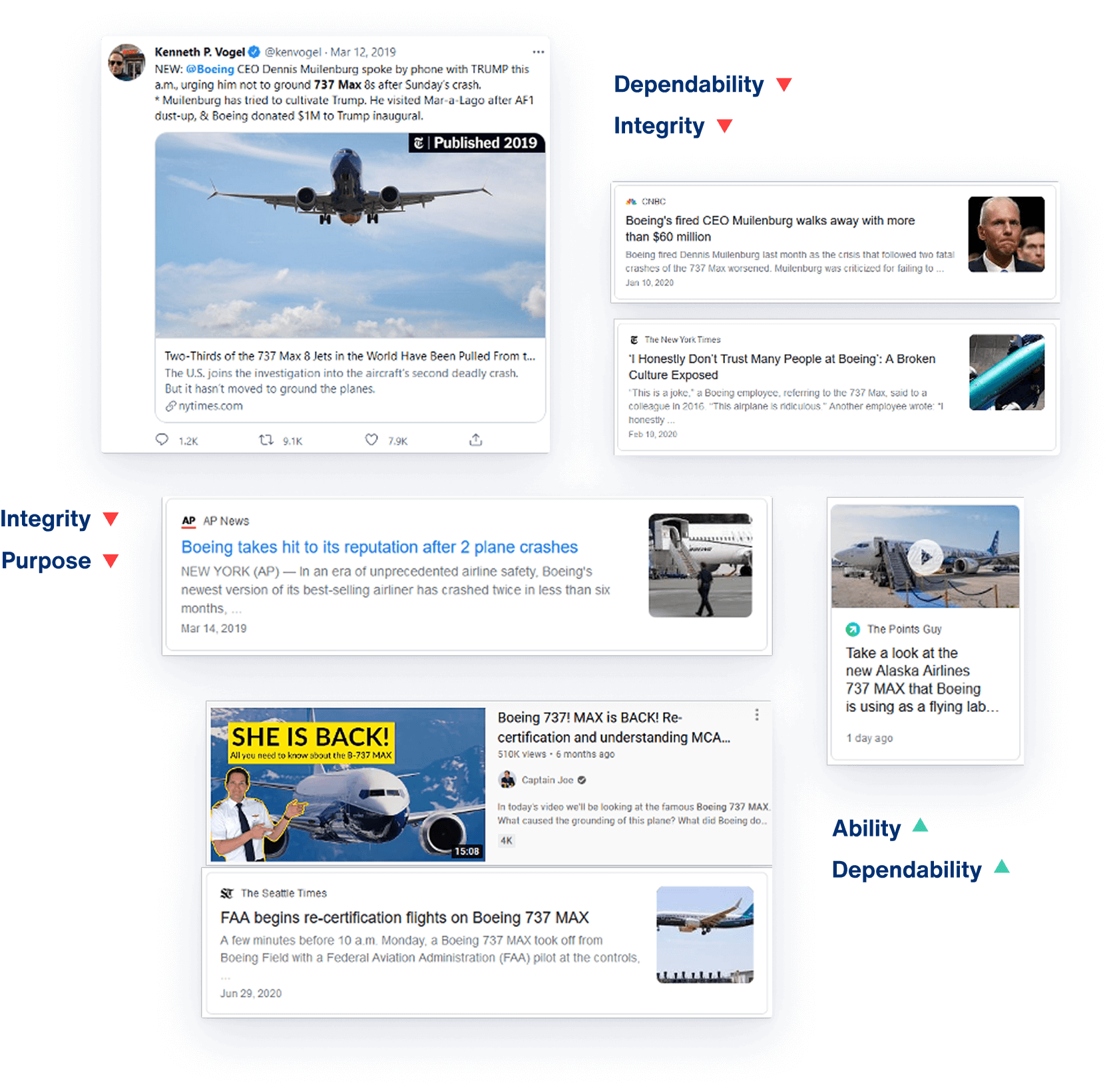 Clicking the “View More” button opens a secondary page with a detailed list of articles influencing the brand within a specific pillar, allowing users to dive deeper into the content and uncover the stories driving shifts in trust.
